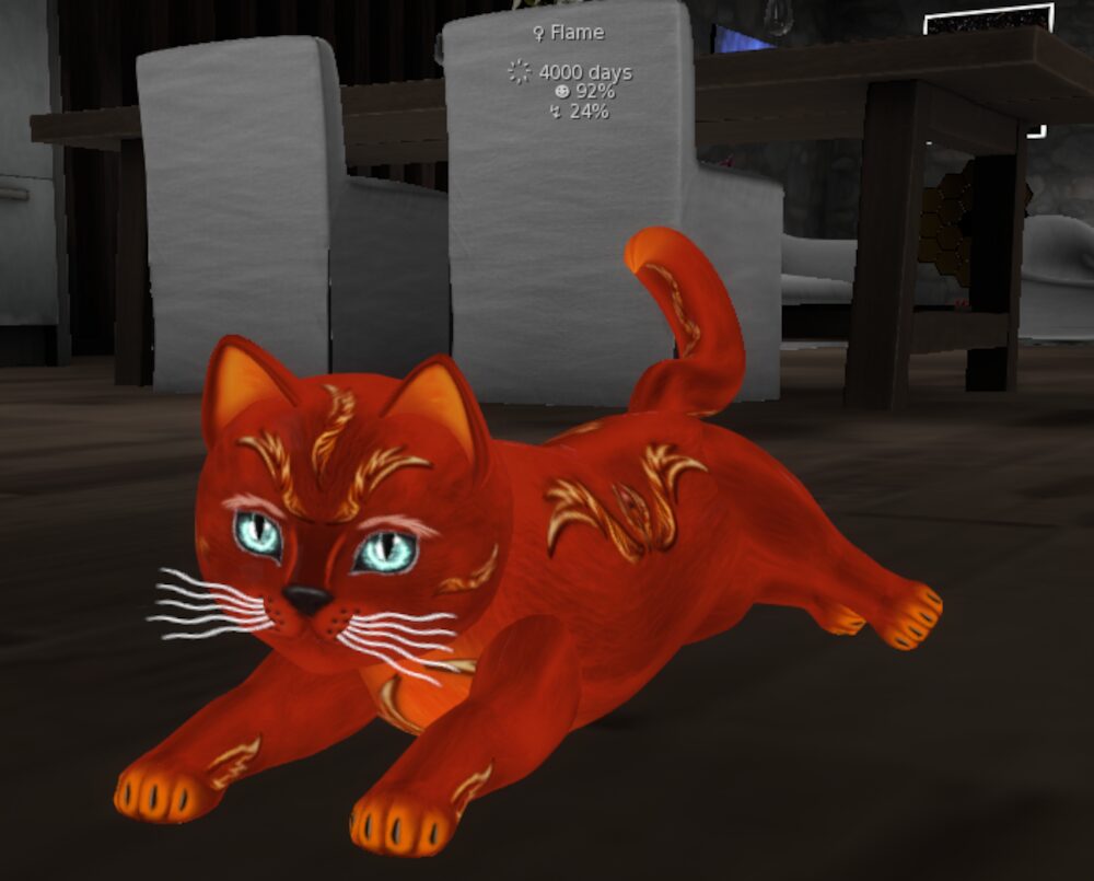 Flame, my KittyCat, is 4000 days old today 🙂 She’s spent all of those days rezzed, sometime wandering around the house, often getting stuck in the bottom of the old house’s pool before I wrote a safety net for her lol