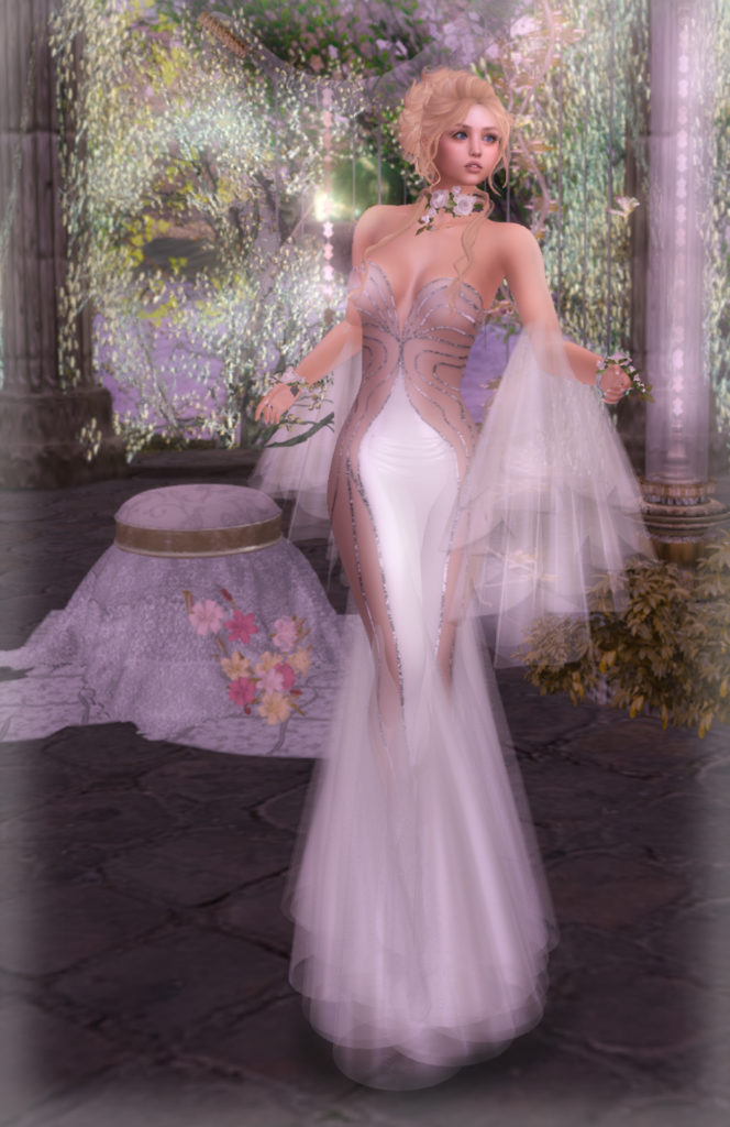 Let’s look first at the Bianca gown from FlowerDreams, available in seven colors. It includes top and bottom layers for the popular mesh bodies as well as Omega, and lots of lovely flowy prim bits as well. Perfect for when you’re feeling a little bit of the fairy tale in you!