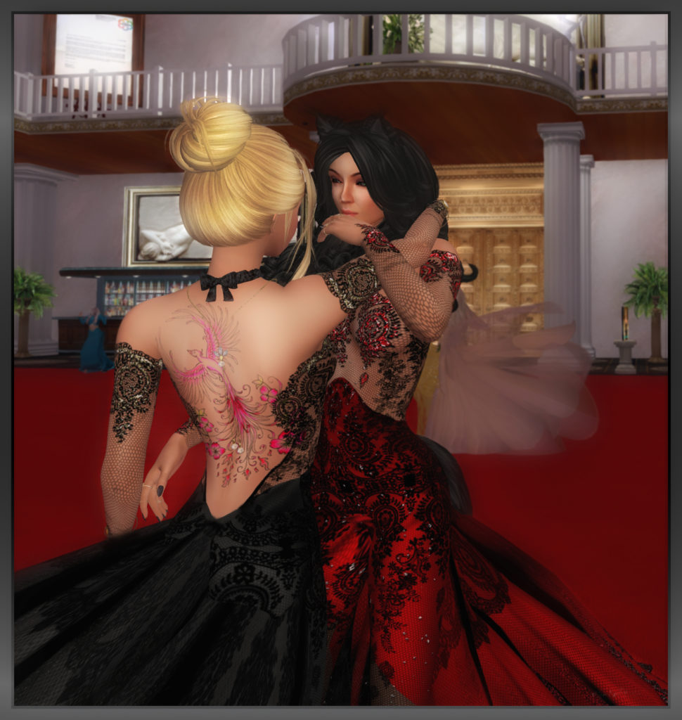 And finally, this week a two-fer: both black and red versions of the same gown, worn by me and my lovely Kie during a formal dance. This is Irina from Utopia, with the amazing detailing that only Utopia can bring. It’s available in seven colors with appliers for the major mesh bodies and Omega. Here the open back makes a nice frame for a detailed phoenix tattoo from U-Design.
