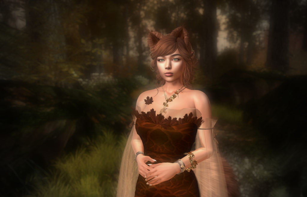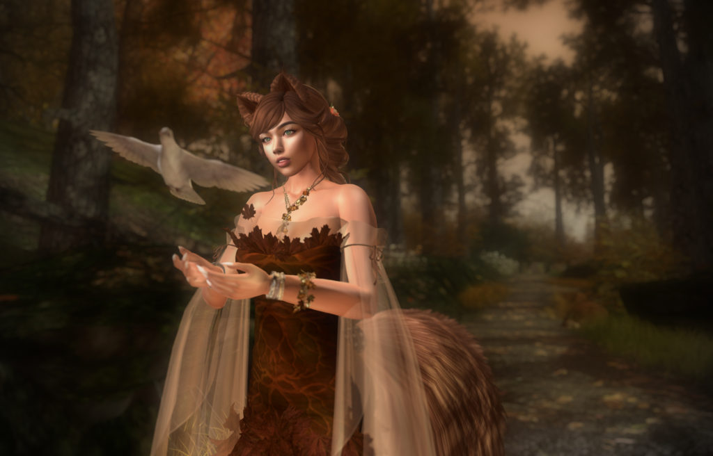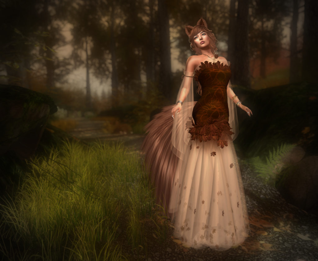 Queen Kie is wearing the Fall edition of the Demeter Gown from Evie’s Closet. Demeter is rigged mesh in four sizes with add-on flexis to create the gown. While rigged mesh is a bit old-school these days, flexis are the best way to create a gown that’s good for something other than standing still for a photograph in. Evie certainly has created some amazing gowns, and this look is absolutely gorgeous.