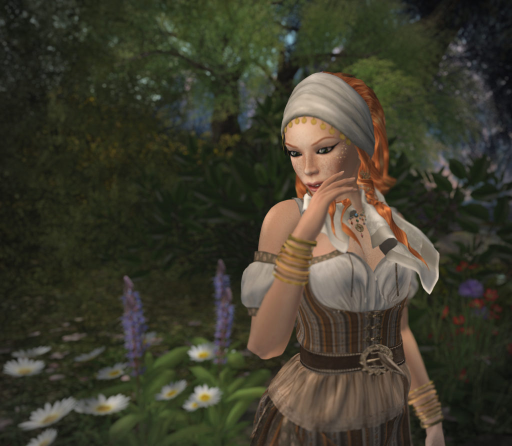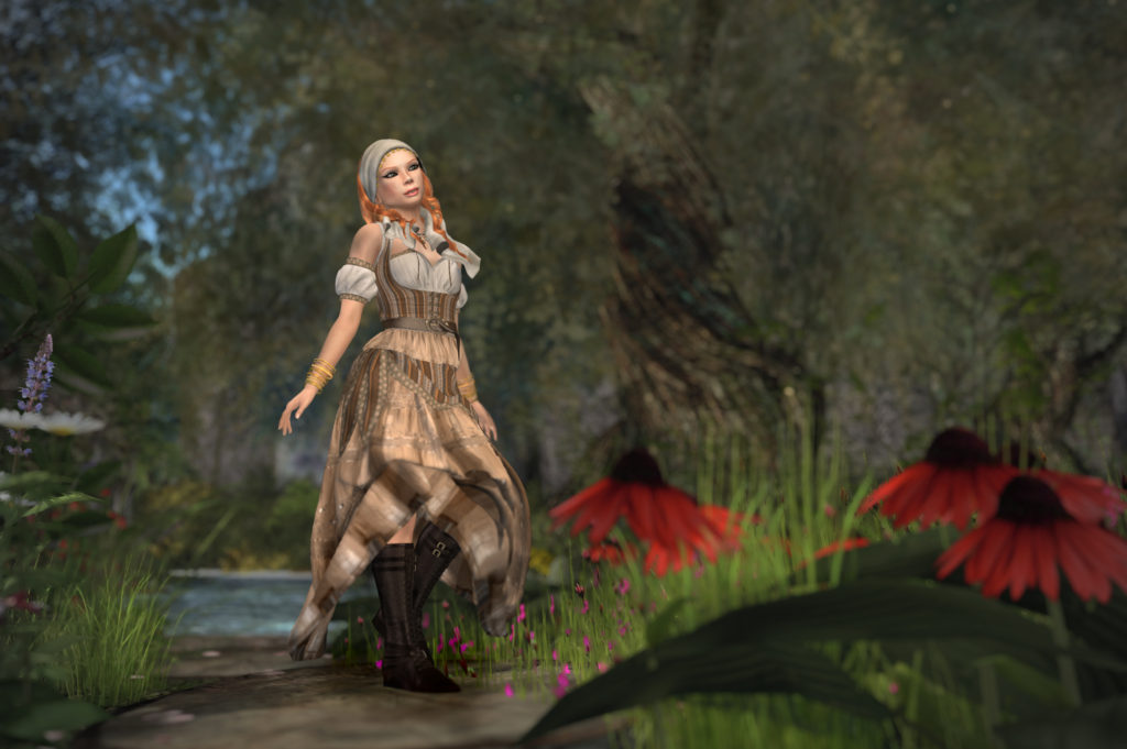 The outfit features separate skirt and top, so you can mix-and-match. The beautiful boots are included, and totally complement the dress. I’m already thinking about other outfits that I can pair these with. I’ve added the beautiful bangles from @rOrO and a necklace and earrings from EarthStones. It must have been fate, for the Esmeralda hair and scarf from Fantavatar & Moonstruck [Oblivion] just matches perfectly, completing the look.