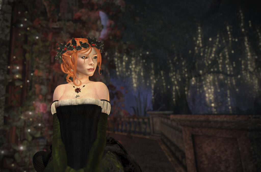 Prima Donna comes in seven beautiful colours. I fell in love with several of them… but the holiday feeling hit me so strongly that I just had to share Emerald with you. The Holly crown from .AiShA. and the Pointsettia ‘n Bells necklace and earrings from EarthStones just matched too perfectly to miss!
