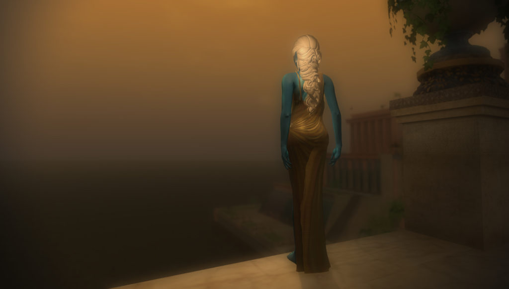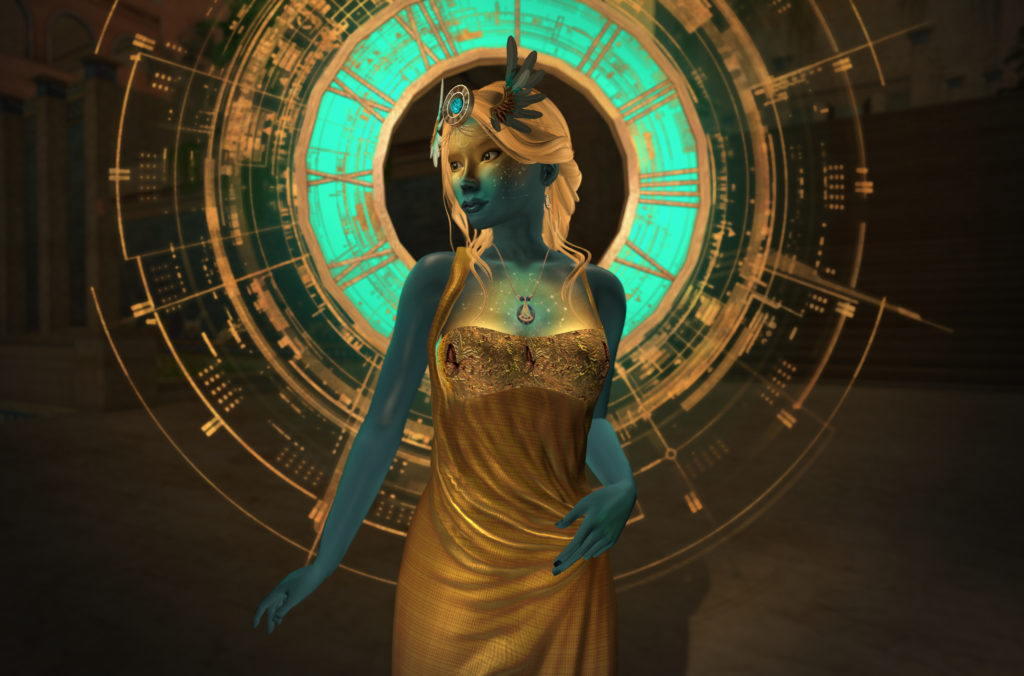 Happy aloha Friday, my friends! You’ve made it to the weekend! How about something slink and sparkly and shimmery, perfect for going out to a little interstellar dancing? I’d been looking for the right thing to wear with the beautiful Opal Laguna skin from Fallen Gods. When I saw Mishmash Fusion‘s Nyota Supernova dress at the Sci-Fi con a couple weeks ago, I just knew it was perfect. I didn’t get the chance to share it with you before now, but it’s the perfect opportunity!