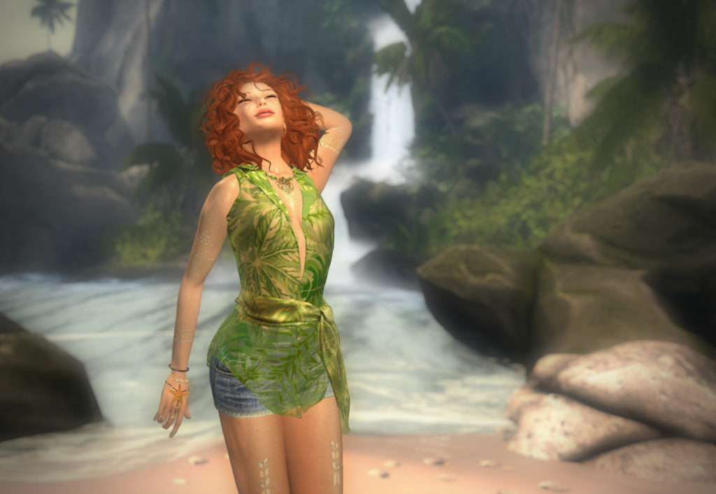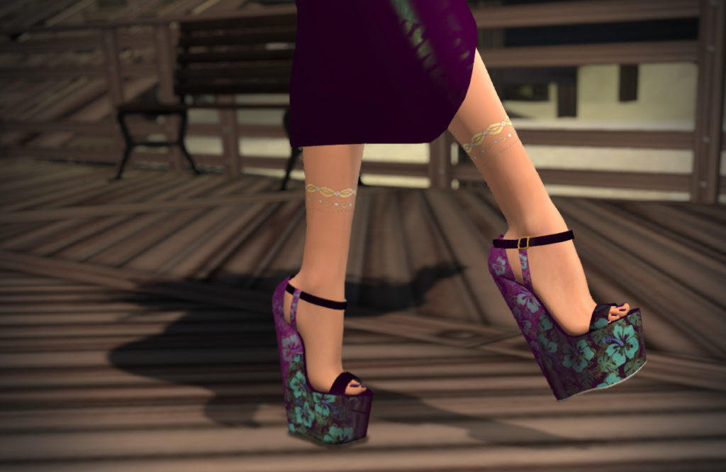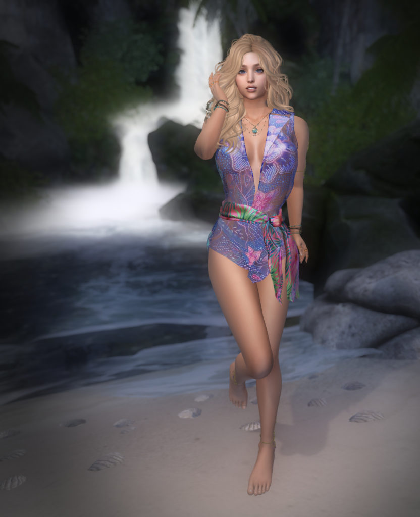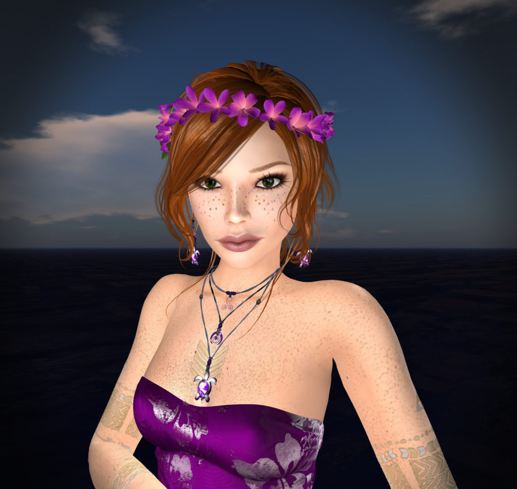 Bare shoulders give an opportunity for some larger jewelry. I really love the Hawaiian-themed Mokolea jewelry set from Luminesse. I’m wearing the dark blue Maluhia set here, as it seemed to catch the colours of the gown just right.