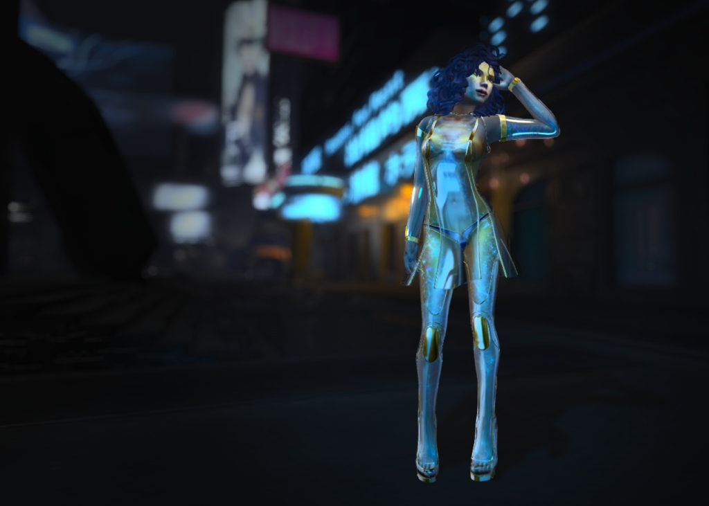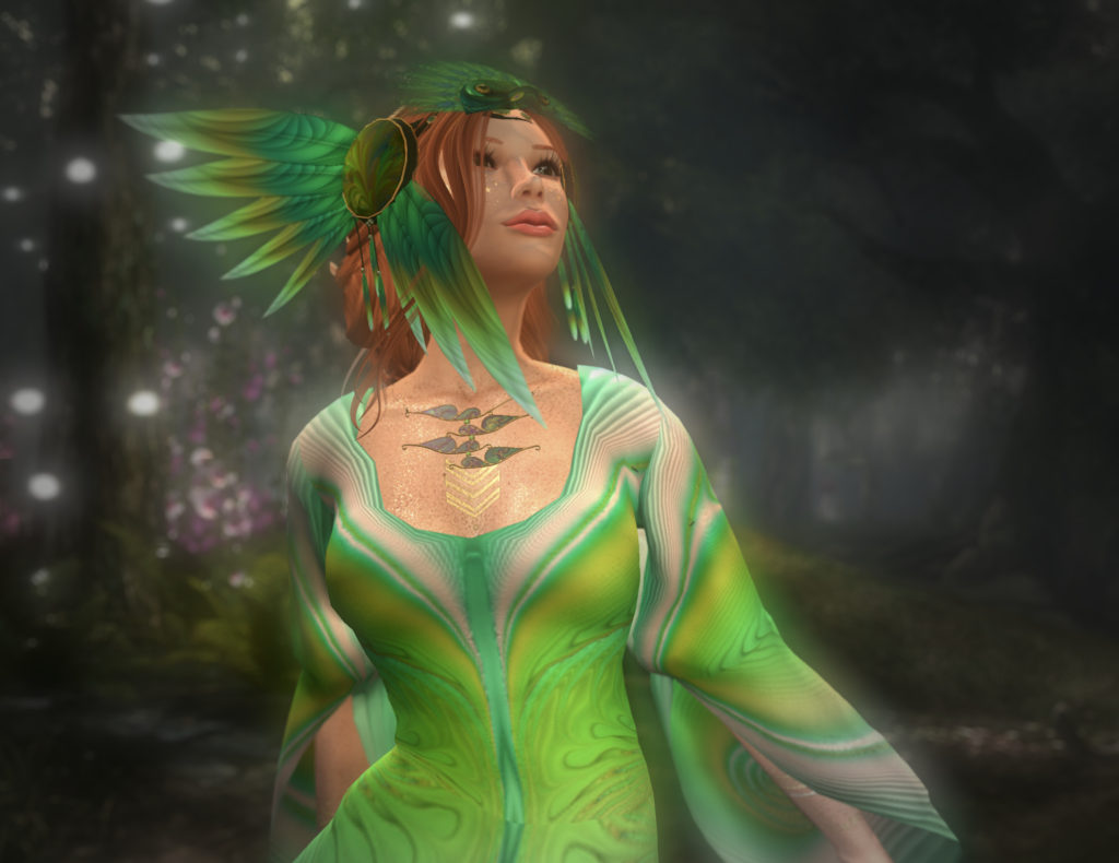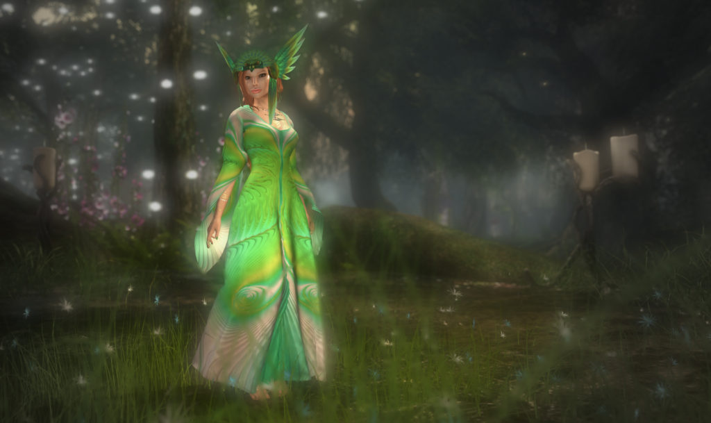 You’ll also note the wonderful halo from *SR* design. The haloes come in seven different colours, and can be modified in colour. There’s a beautiful shimmering kind of effect, and a slow rotation of the whole thing. As i write this up, I’m wearing it with a purple fae that I wear while I dance on the Fairchylde. It mounts on the avatar centre, so it stays in place behind you as you dance, which is kinda neat. I’ll have to take another pic and show that off to you later!