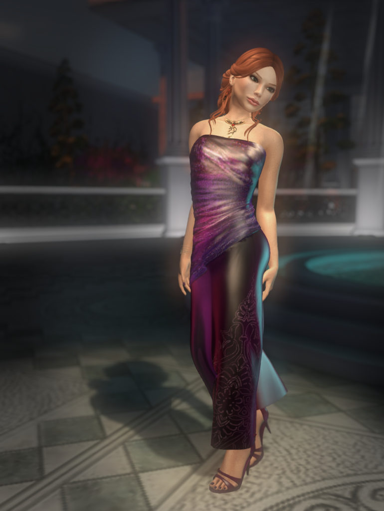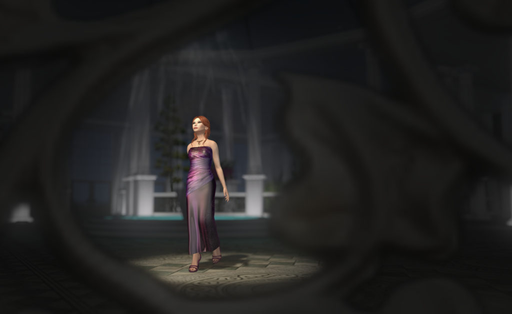 There’s a wonderful set of masks from from AIR. Maschera a un’ala comes in gold and silver versions for Relay for Life, and has full, left, or right side only. I love the idea of the half-mask, so, here you go. It really works nicely, I think, with Azul’s Essi gown. The mask is resizable mesh, so getting a good fit is pretty straightforward.